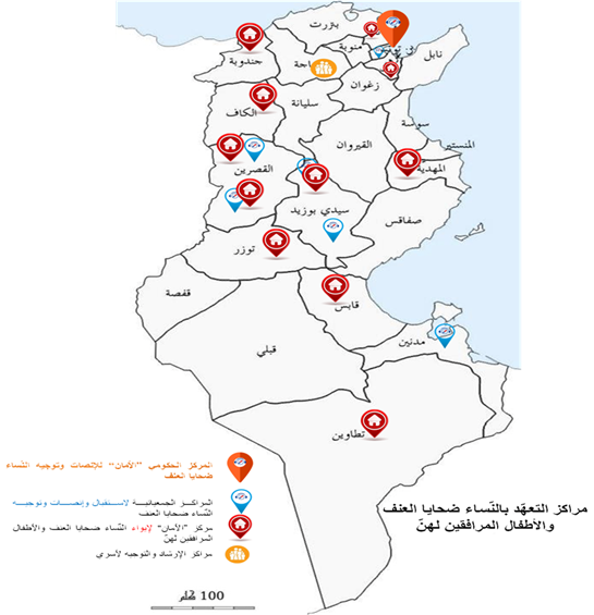 الإدماج الاقتصادي والاجتماعي: مساعدة ضحيّة العنف على تطوير قدراتها واستعدادها لمجابهة الأعباء الاجتماعيّة والاقتصاديّة المحمولة عليها وتسهيل إدماجها في المجتمع والمحيط الذي تعيش فيه وذلك من خلال الأنشطة التّكوينيّة والتوعويّة والتّثقيفيّة والتّرفيهيّة لدعم قدراتها على الاندماج ووضع مشاريع تدخّل فرديّة أو جماعيّة متلائمة مع خصوصيّاتها وتمكينها من الحفاظ على روابطها الأسريّة. وقد حرصت الوزارة على دعم خدمات الجوار لفائدة النّساء ضحايا العنف من خلال التّرفيع في عدد مراكز التّعهّد بالنّساء ضحايا العنف والأطفال المرافقين لهنّ، في إطار الشّراكة مع الجمعيّات ذات الخبرة في المجال، ليصل العدد حاليّا إلى 17 مركزا لإيواء النساء ضحايا العنف، وبالتالي ارتفاع طاقة الاستيعاب بلغت 258 سريرا.